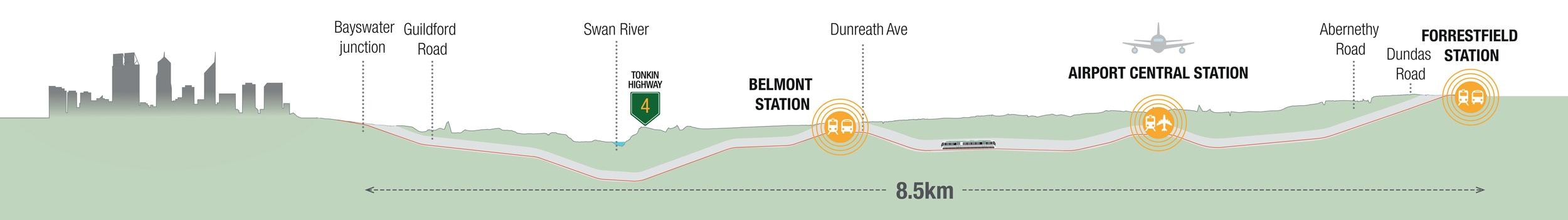 福雷斯特(Forrestfield)机场线将由铁路双线隧道与三个崭新的福雷斯特站、中央机场站和贝尔蒙特(Belmont)站所组成。